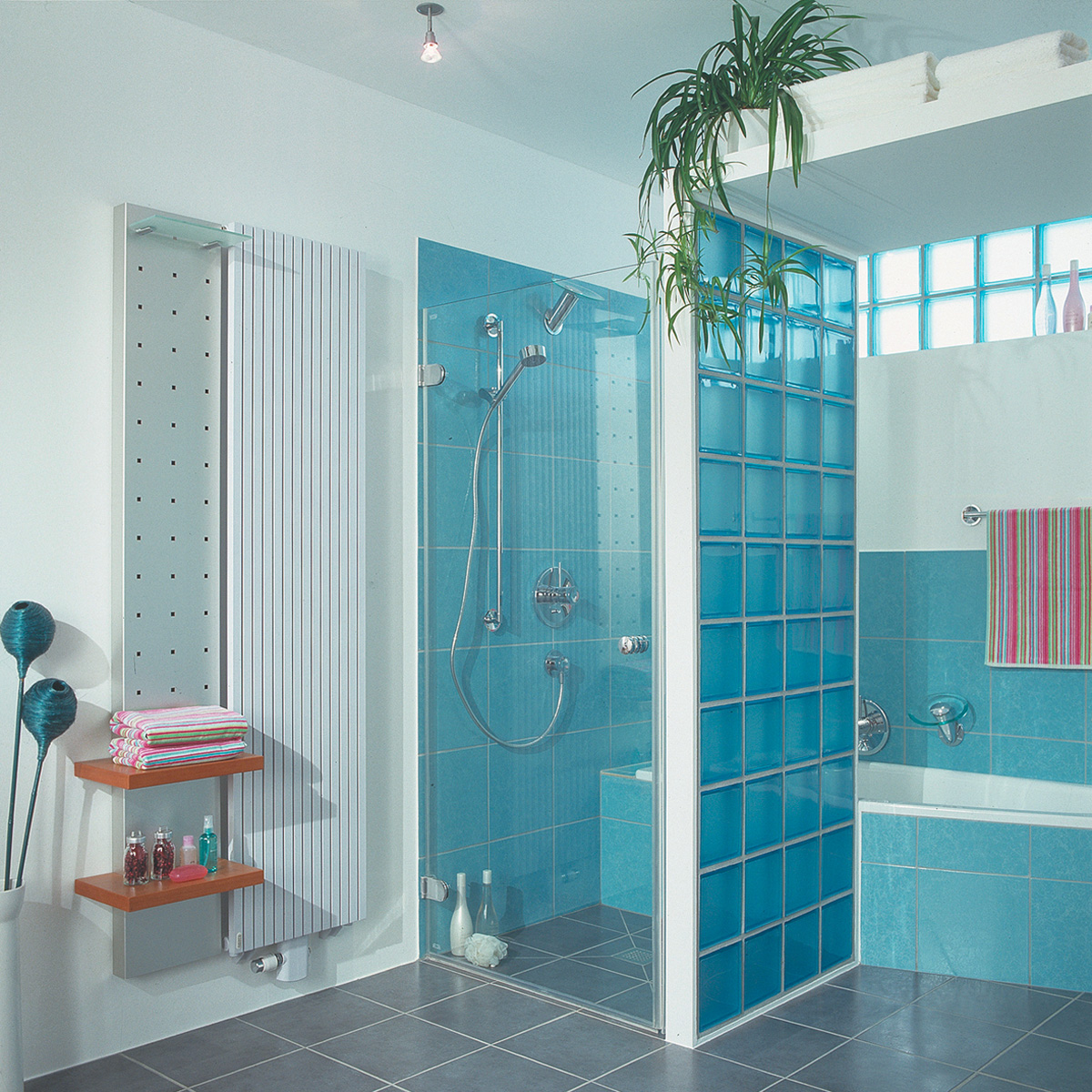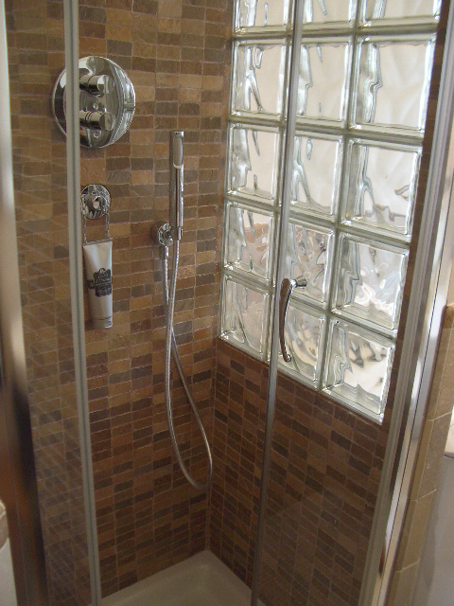 Si vous souhaitez monter une paroi de douche dans votre salle de bain, nous vous recommandons le kit de montage, avec ou sans encadrement. Il est également recommandé de laisser un espace en partie haute du mur en briques verre, entre la dernière rangée de briques et le plafond, afin de laisser circuler l’air librement.